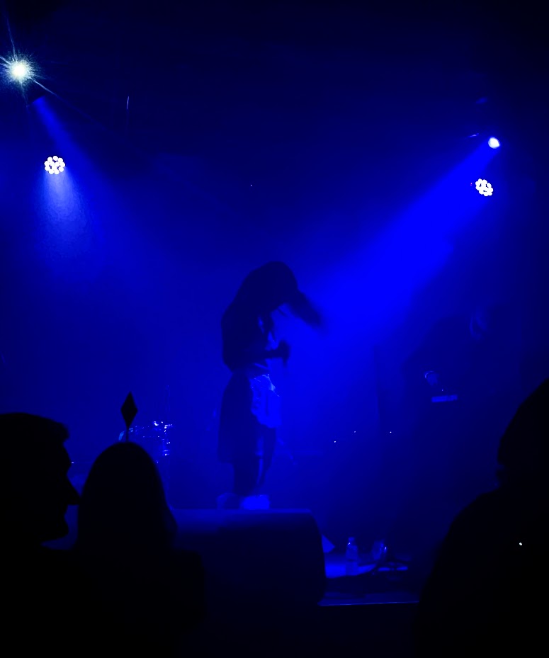 Sarah Meth was up next, a mellow and soulful set, though not with any less passion as the previous acts. A North-Londoner, Meth dabbles in indie-pop for those with a taste for the slightly off-kilter. Pollyfromthedirt followed – an act I found particularly captivating as they effortlessly controlled the digital elements of their performance with the live vocals. A young guy from Darlington singing in an Orville Peck-esque face mask, telling the crowd, in a distortedly digital sound that ‘Theres no such thing as England’ was both believable and thoroughly watchable. There was something oddly professional about this new artist’s vocals (would it be so wrong to reference Lewis Capaldi?) but the way Pollyfromthedirt had condensed this mainstream quality and mixed it with more unsettling, avant-garde aspects was oddly moving. Pollyfromthedirt onstage mixing created a sound reminiscent of Bon Iver’s 2011 album, Bon Iver, Bon Iver, or James Blake’s The Colour in Anything (2016), whilst his witty, observational lyricism had a quotidian political twang of early Billy Bragg, ‘I’m a liar for a weekend in Majorca’. Managing to combine these polarised sounds into something cohesive is a testament to their solo live presence: Pollyfromthedirt is fully in control of every aspect of each track.
