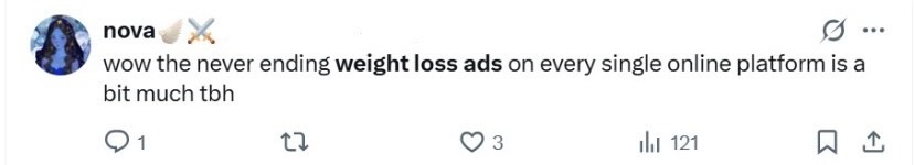 “Seeing the ads constantly makes me feel really sad that such a huge part of society is so obsessed with not being fat/always trying to lose weight. I grew up seeing fatphobic content everywhere I turned and I feel like it’s coming back round again”.