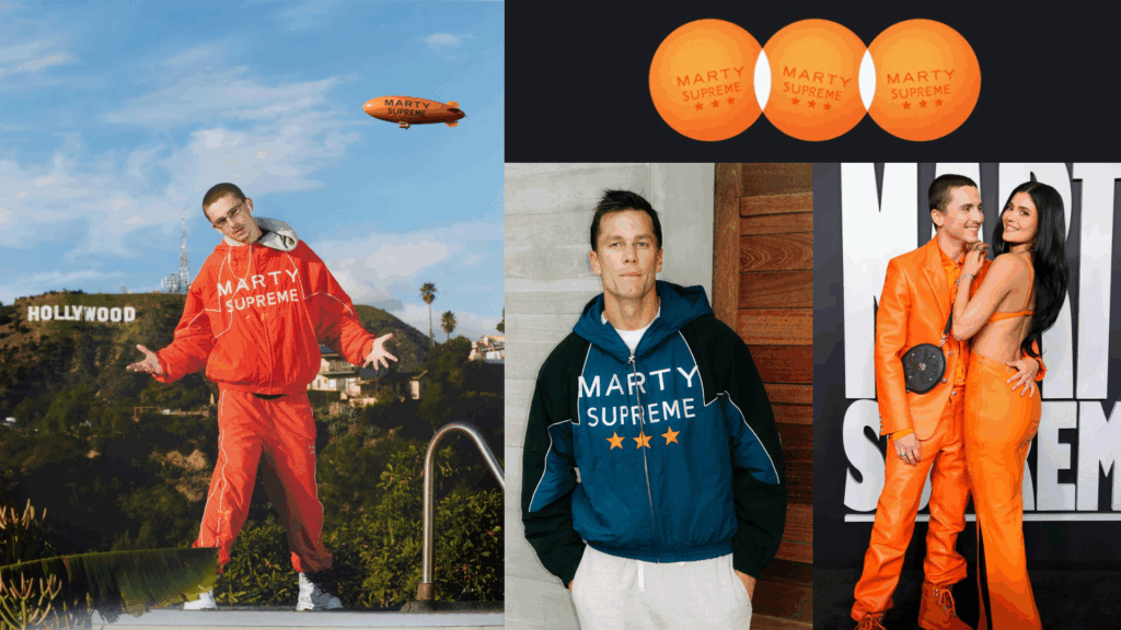 Perhaps the boldest use of orange came from Timothée Chalamet and his campaign for ‘Marty Supreme’. In an 18-minute Zoom where he casually ran through his “marketing plans,” Chalamet, inspired by Barbie’s pink, declared the film’s colour would be ping-pong orange. And he went all in. Attending a surprise screening of the movie trailed by ping-pong ball-masked henchmen. A ping-pong orange ‘Marty Supreme’ blimp drifting across Los Angeles. Chalamet standing atop the Las Vegas Sphere, transformed into a glowing ping-pong ball. And, of course, he sent out Marty Supreme track jackets, designed in collaboration with Doni Nahmias, A24, and his stylist Taylor McNeill, to cultural greats like Justin and Hailey Bieber, Kid Cudi, Tom Brady, Central Cee, Kendal Jenner and more. By the time Timothée Chalamet and Kylie Jenner arrived head-to-toe in cosmic orange at the LA premiere, the bold choice was hardly surprising. Orange had transcended being just a colour; it had become a mood, a moment, and an integral part of the ‘Marty Supreme’ universe. The genius? Orange was already everywhere. Chalamet didn’t start the trend; he simply hijacked it.