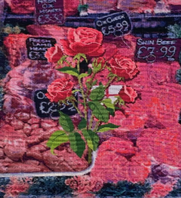 Charlotte Dawson’s painstakingly detailed cross-stitching evoked a strong sense of nostalgia in her piece English Rose & British Beef. Her investigation into texture through the medium of cross-stitch gives her piece a multi-dimensional sensory experience. The fresh rose cutting through bloody beef reflects the lives of the working-class towns that I grew up in, passing flower stalls and butchers with friends. Dawson went on to discuss how she draws her inspiration from ‘vessels’, an apt metaphor for the gallery that night; a holding space, full to the brim with culture.