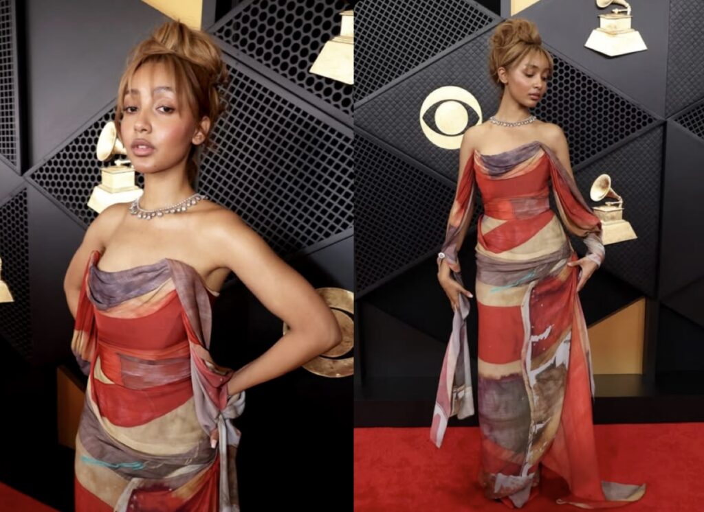 Iconic as always, PinkPantheress never disappoints with her signature fashion choices, channeling the essence of Britishness through plaid patterns into her Y2K inspired outfits and her look at the Grammy Awards further augmented this motif. She wore a piece by one of her favourite designers: Vivienne Westwood, a scarf in the colours of the Union Jack which was draped skilfully to create the look of a dress. A simple idea, executed with maximum finesse, giving her a spot on my shortlist.